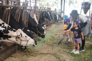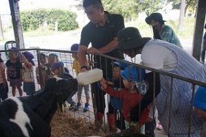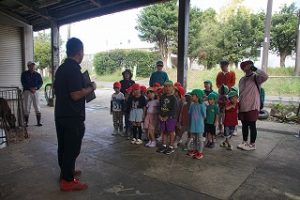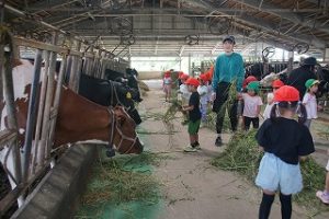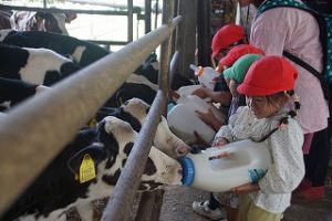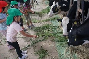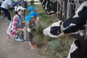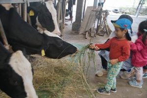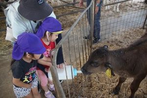 子牛にはミルクをあげる体験をさせてもらい、大きな哺乳瓶を持って飲ませたのですが、子牛の勢いにびっくり驚く子どもたちです😆