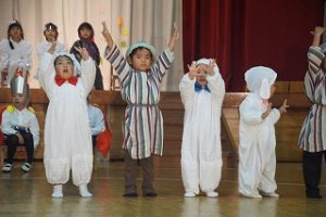 もも組さんもたくさんの保護者が見ている中でしたが、音楽に合わせてノリノリで楽器を鳴らしたり、踊ったりしていましたよ。なによりも保護者の方々が途中、途中で温かい拍手をくださったのがとても嬉しかったです。
