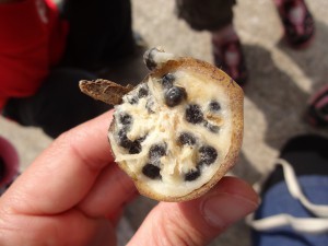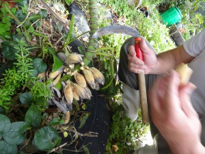 「食べた~い」と子ども達。皮をむいてみると、なんとバナナに種がいっぱい入っていました。