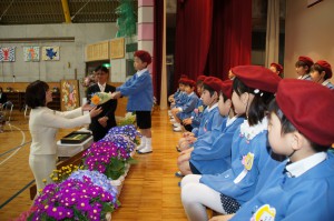 テーブルにあるお花は昨年退職したM先生からいただきました。この1年遠くからいつも明朗幼稚園の事を応援し見守ってくださり、行事の度にねぎらいの言葉をかけてくださいました。