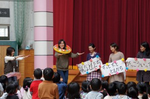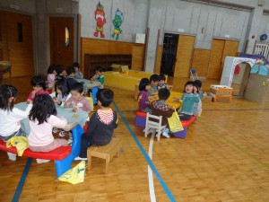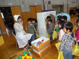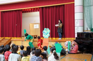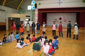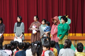 今年度最後の絵本の会。「泣いた赤鬼」の劇や「みんなともだち」の歌を披露して下さいました。忙しい合間に小道具など準備をしてくださいました。本当にありがとうございました。