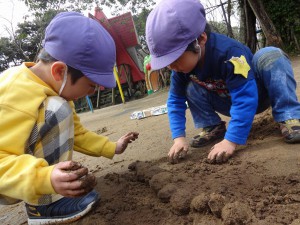 どろどろの土をピチャピチャ丸めて、お団子を作っていました。そしていつの間にか、どろだんごのなが~い道ができてきていましたよ。