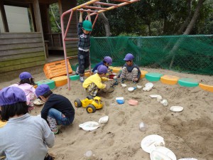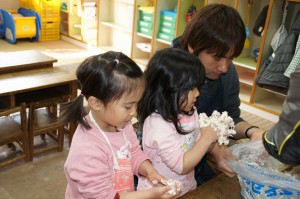 生地を寝かしている間にお外で遊びました。「こおりおにしよう」の子どもの声に「えっ!なにそれ?」と聞いていたお父さん先生もいましたよ。