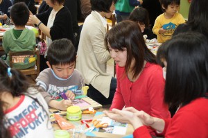 その後はプレゼント交換。年長からは粘土でつくったストラップ、年中・年少からはティッシュケースのプレゼント!とても喜んでいた子どもたちです☆