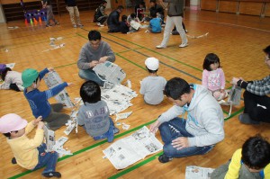 今度は体育館で新聞紙あそび。新聞紙拾いやびりびり破って楽しんでいました。