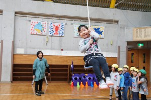 こすもす組は生まれてから今日までの成長を振り返り、たんぽぽ組はなわとび遊びをしました。