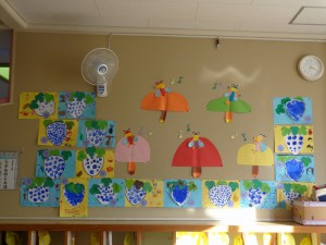 13日、ひわまり組のお友だちと実習生と一緒にぶどうを作りをしました。はさみでぶどうの形に切ったり、絵の具のスタンプをしたり、お絵描きしたりしました。
