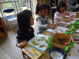 前の日から今日のために葉っぱを集めていた子どもたち。「何を作ろうかな?、迷っちゃう」「いちょうの葉っぱだ」と一枚一枚葉っぱを眺めながら、楽しんでいましたよ。