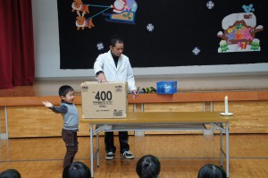 段ボールをおもいきりたたくとロウソクの火が消えたよ!次はなんだろう?とみんな興味津々