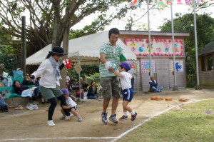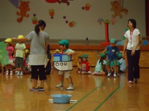 ドキドキ競争では、魚釣りに挑戦。2人で船に乗り、わかめをくぐって、魚を釣ります。そして、落とさないように気をつけながら、タライの中に魚を入れて、バトンタッチしていきます。わかめをくぐるとき小さくなるところがかわいいですよ(*^_^*)