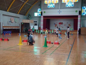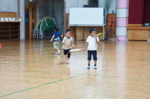 今日はあいにくの雨になり体育館で年中長のドキドキ競争を行いました!