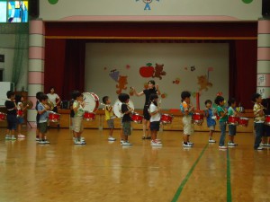 大太鼓・シンバル・3個太鼓・2個太鼓・1個太鼓とそれぞれのパートに分かれて体形を変えたりしながら一生懸命取り組んでいます