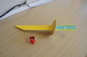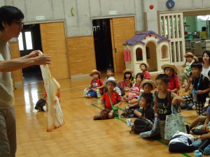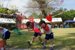 今回のプレゼントはなんと黄色い剣とハートの指輪!!「いえ~い」と喜んでいた子どもたちです。先生たちからプレゼントを貰うときの子どもたちはいつもの運動会のおけいこの時よりもかっこよかったですよ。
