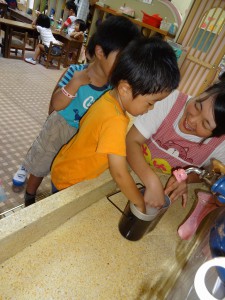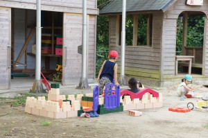 そんな中お預かりで幼稚園に来ている子どもたちは木陰を見つけて遊んでいます。今のブームは、学校を作って遊ぶこと。ちゃんと年長さんが中心になって作り、ごっこ遊びをしています。