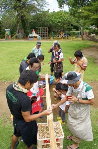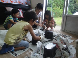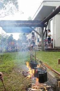 その後は、みそ汁と飯ごうに「おいしくなあれ」のおまじないをみんなでかけました。