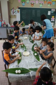 おやぢ保育が楽しく行われている中・・主任会・・という一見タイトルがすごい感じの研修会があり、地区の幼稚園主任の先生たちが集まりました。今年度は地区のテーマが「食育」ということで種子島の食材を使った料理を5品作りました。
