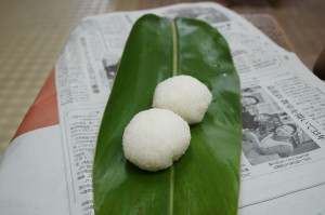 年長さんは手でにぎりました。 しゃりんの葉っぱに包み「おいしそう!」と!