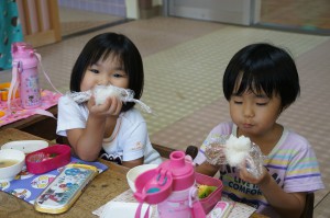 自分たちで育てたお米や野菜でつくったおにぎりとみそ汁「おいしーい!!」とっても楽しそうにしながら食べていた子どもたちでした(^o^)