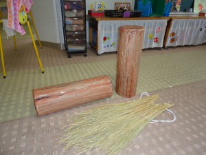 右は、かさじぞうで登場するおじいさんが羽織る簑と3歳児のおゆうぎで使う木です。4歳の男の子が「先生!これどこからもってきたの?」というぐらい本物に見えたようです。実は・・・私も。