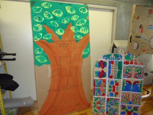 これが今年先生たちが手作りで作った作品の一部です。左の木は、たんぽぽ組さんと先生が協力して作った豆の木とドアです。どこで登場してくるかは、本番のお楽しみ♪