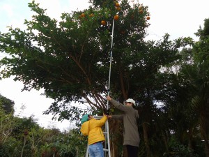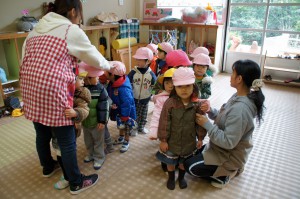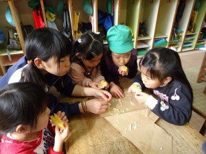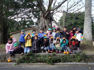 今年もみかんの収穫の季節となりました。昨年よりはみかんの数も少なかったのですが、こどもたちは随分前から楽しみにしていました。長い枝切りばさみを使ってなんとか収穫!もぎたてのみかんは、少し酸っぱかったものの「おいしいね!」「いっぱいおかわりしたよ!」とこどもたち。すっぱいみかんが苦手な男の子に「風邪のばい菌をやっつけてくれるパワーが入っているよ!」というと「じゃあ少し食べてみようかな・・」といい、少しだけ味わっていました。風邪引かないといいね!