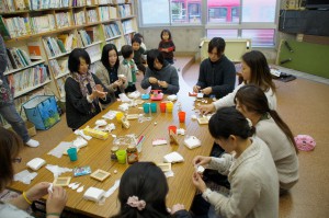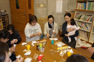 月曜日はお母さんたちのサークル活動の日です。毎月1度か2度ほどの活動を実施しています。この日は、お母さんたちのお友だちを講師として呼び、クレイアートに挑戦していました。この場が楽しく子育ての息抜きの場としてこのまま楽しい集まりとなればいいな・・と思います。