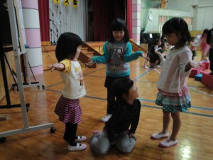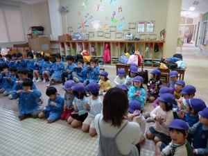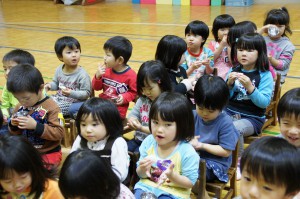 すみれぐみ(3歳児)・・「世界のはじまり」より。いつもと変わらずにこにこです。