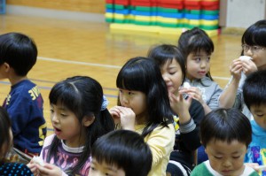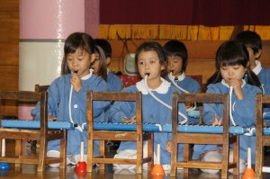 年少さん、年中さんは、ハーモニカとカスタネットでお稽古中。