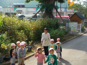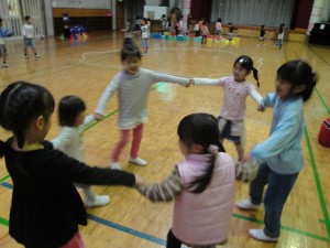 小さいお友だちの手を優しくつなぎ,遊ぶ姿に思わずシャッターを押していました。 すみれぐみさんでは、あーぶくたった にえたったー♪がブームのようです。